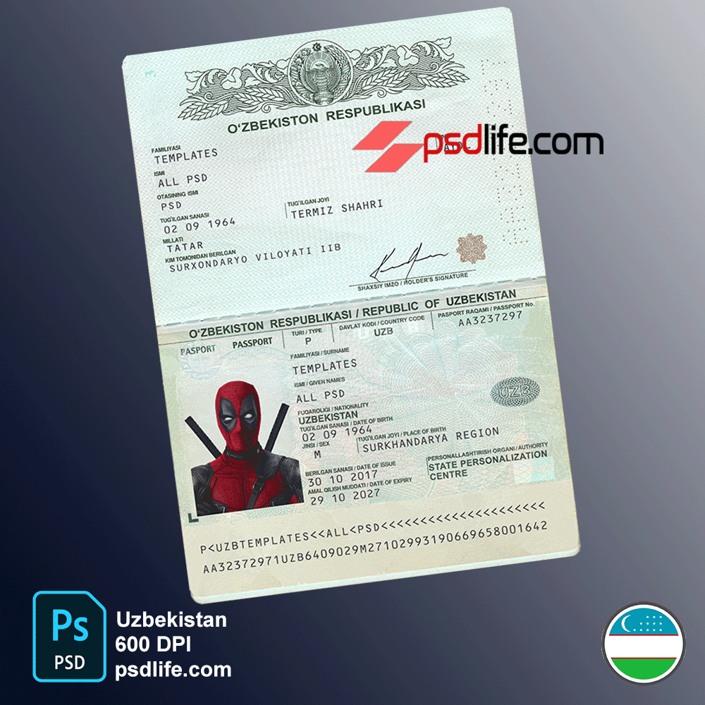 The Uzbekistani passport is currently ranked 85th place on the Guide Passport Index. It provides visa-free access to 58 destinations. This gives it an overall low mobility score. Uzbekistani passport holders have visa-free access and visas on arrival to countries such as Russia, Turkey, Ukraine and Indonesia. Uzbekistani nationals require a visa to enter about 171 destinations in the world. Some of the destinations where a prior visa is required are the United States, the entire European Union, India and Japan This is download free UZBEKISTAN PASSPORT psd template. Fully editable uzbek id photoshop template. High quality template, change photos, Easy to customize.
