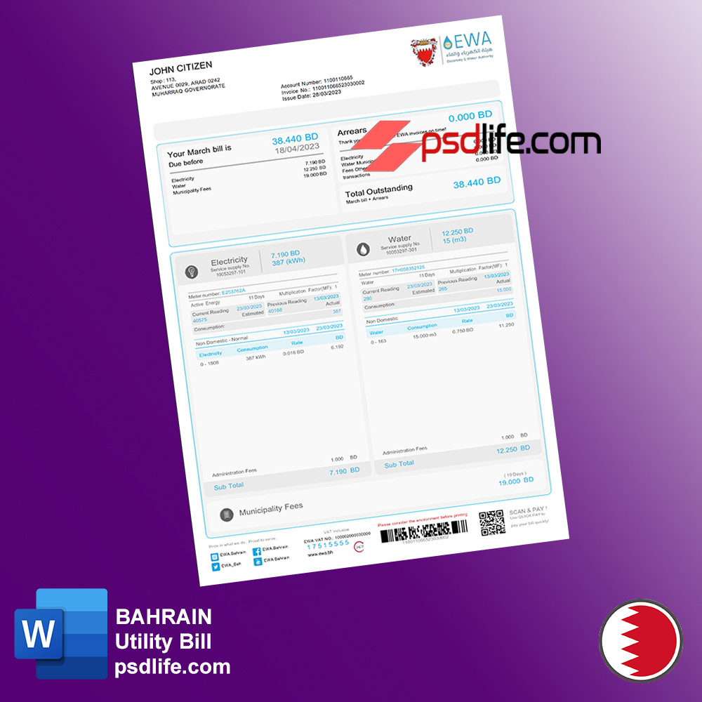Bahrain EWA ( Electricity and Water Authority ) utility bill recently signed a lump-sum contract with Alba for the engineering, procurement, and construction (EPC) of six rectifiers. The total output of the rectifiers will be 1,354 MW, making them the largest in the world. Download free Bahrain EWA ( Electricity and Water Authority ) utility bill fully editable in word format | you can edit it in Microsoft word