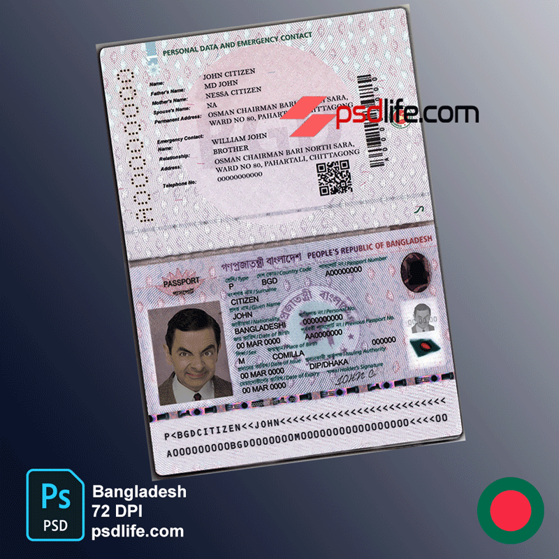 Bangladesh passport, presently as Machine Readable Passport (MRP), is issued by the Government of Bangladesh only to its citizens for the purpose of international travel. It must be either in the custody of the bearer or of a person duly authorized by its bearer. If lost or destroyed, the fact and circumstances must be immediately reported to the nearest Bangladesh Mission and also to the local police authorities. in Bangladesh passport fake psd & Machine Readable Pass (MRP) | thai passport novelty psd fake editable | বাংলাদেশ পাসপোর্ট জাল psd টেমপ্লেট সম্পাদনাযোগ্য.