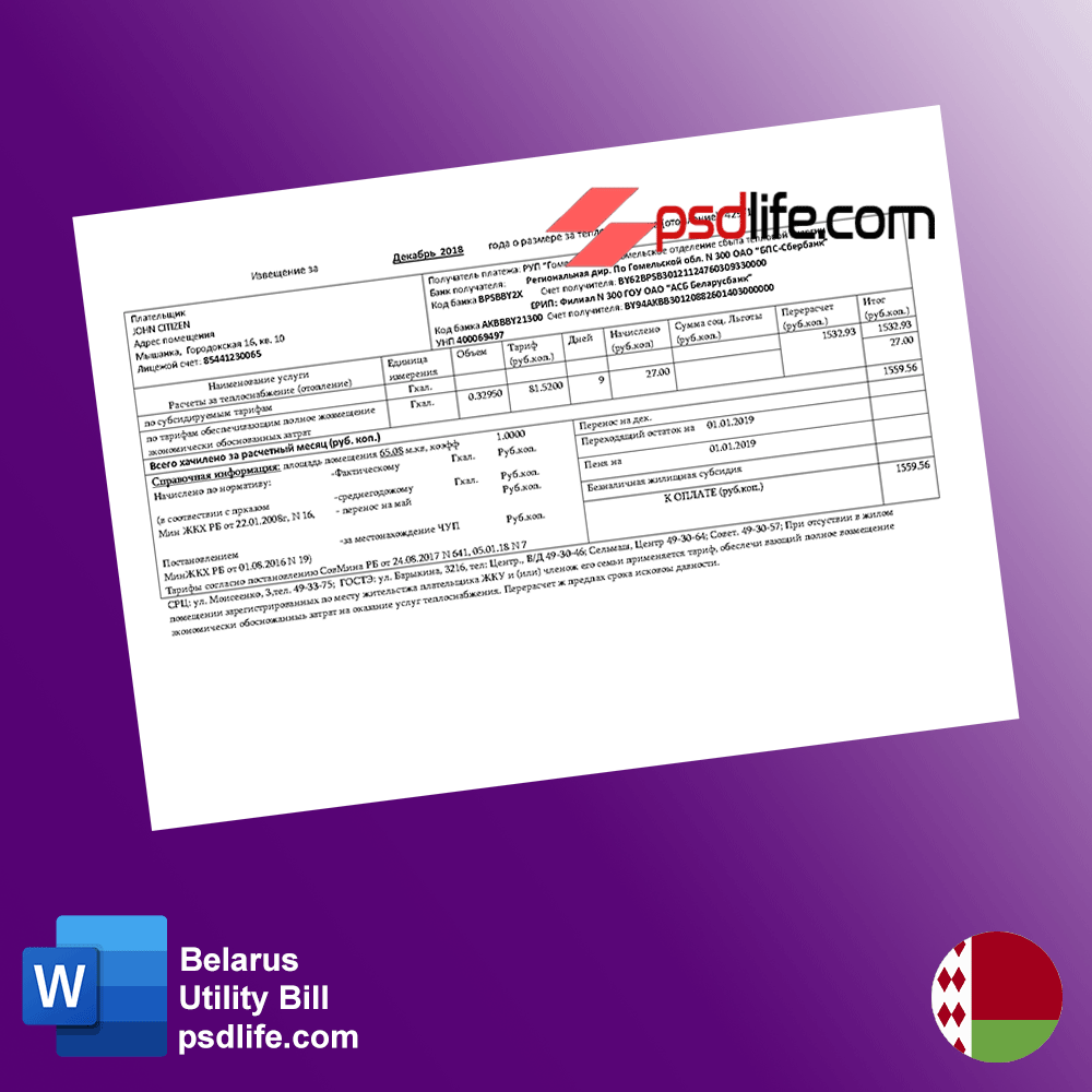 Grab now fully editable Belarus bill Psd Template from our website psdlife and put your own info to create a fake copy of Fake Belarus utility bill psd template and ready your own novelty documents. It’ll be so beneficial if your ID Card is expired, stolen or not available. We also have passport psd template, ID Card psd template, drivers license psd template & utility bill psd template.
