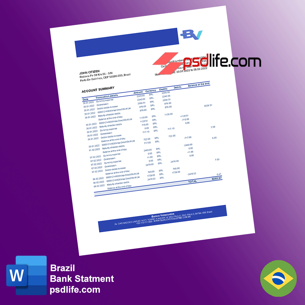To carry out financial transactions in the country, notably the receipt of amounts and the payment of suppliers and employees, each company must have a corporate bank account in Brazil. The process of opening a corporate bank account in Brazil is usually quite simple. However, this process must respect the minimum requirements determined by the Central Bank of Brazil. This fakepsd is the public entity responsible for the regulation of bank accounts. in brazil bank statement template designe psd template | Proof of address template psd | download free bill psd . Learn how to open a corporate bank account in Brazil, the largest economy in Latin America.
