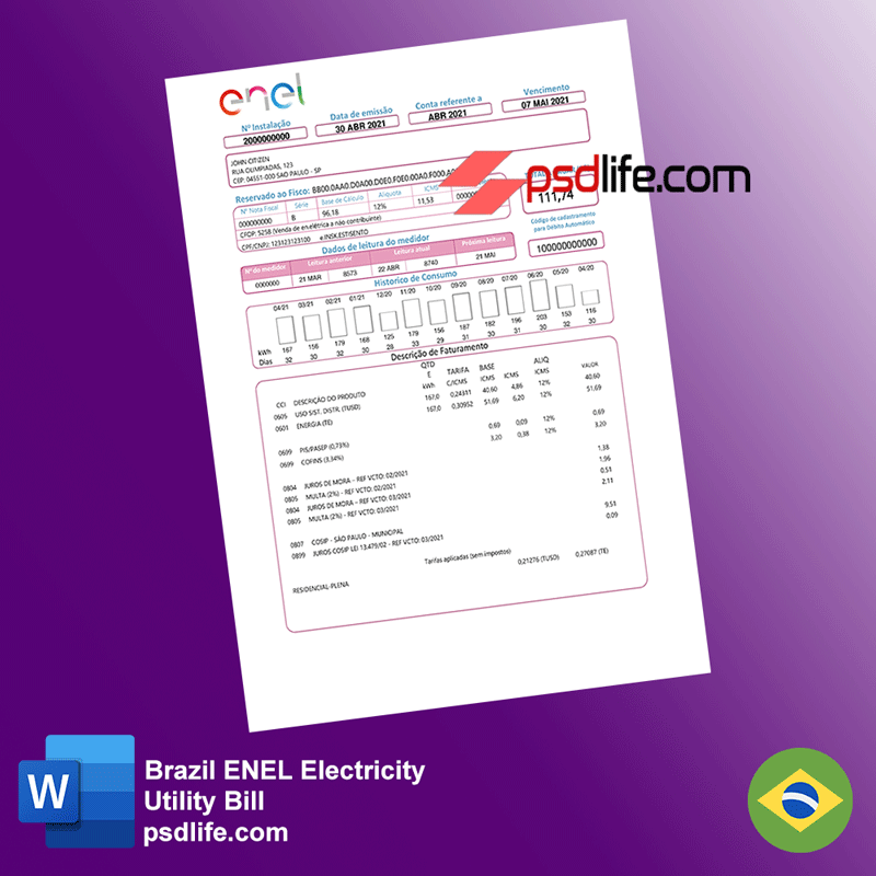 Be the first to review “Brazil ENEL electricity utility bill Word document format template”