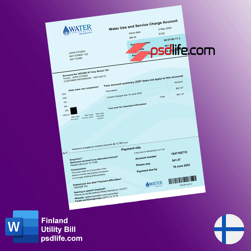 Just do your own custom modification. Superb arranged format. You may easily replace the picture for your own needs, change content, and so forth. Finland Water Corporation utility bill