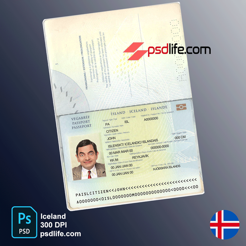 Iceland passport psd template. Icelandic passports are issued to citizens of Iceland for the purpose of international travel. Besides serving as proof of Icelandic citizenship, they facilitate the process of securing assistance from Icelandic consular officials abroad (or public officials on a mission of another Nordic country in case an Icelandic consular official is absent). in Icelandic passport psd | Ísland vegabréf falsað psd sniðmát breytanlegt ókeypis niðurhal | Iceland passport fake psd template editable free download.