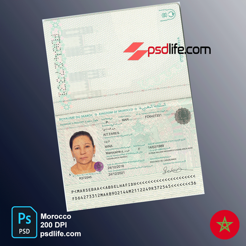 Morocco passport card template. Moroccan passports are issued to nationals and citizens of Morocco for the purpose of international travel. Besides serving as proof of Moroccan citizenship, they facilitate the process of securing assistance from Moroccan consular officials abroad if needed. Since 15 December 2009, a biometric passport was available for all new applicants. in Morocco (Marco) Country in North Africa psd template doc passport | fake passport photoshop document templates free download editable.