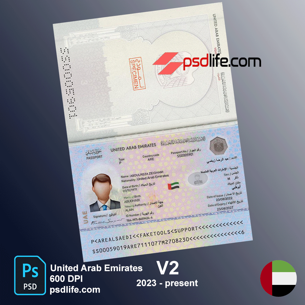 United Arab Emirates Passport template psd. Fully editable photoshop template. High-quality template. Easy to customize, Layer based, on fonts included. UAE Passport template. you can edit this template and put any name, address, license number, Id number, birth date, height, weight, expiration date, change photos, etc.
