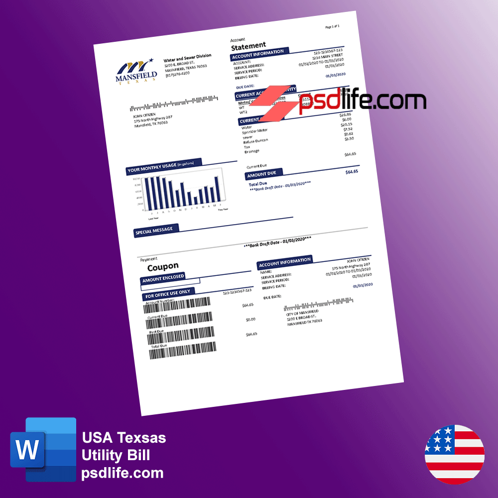 USA Texsas Mansfield Water and Sewer Division utility bill in word format